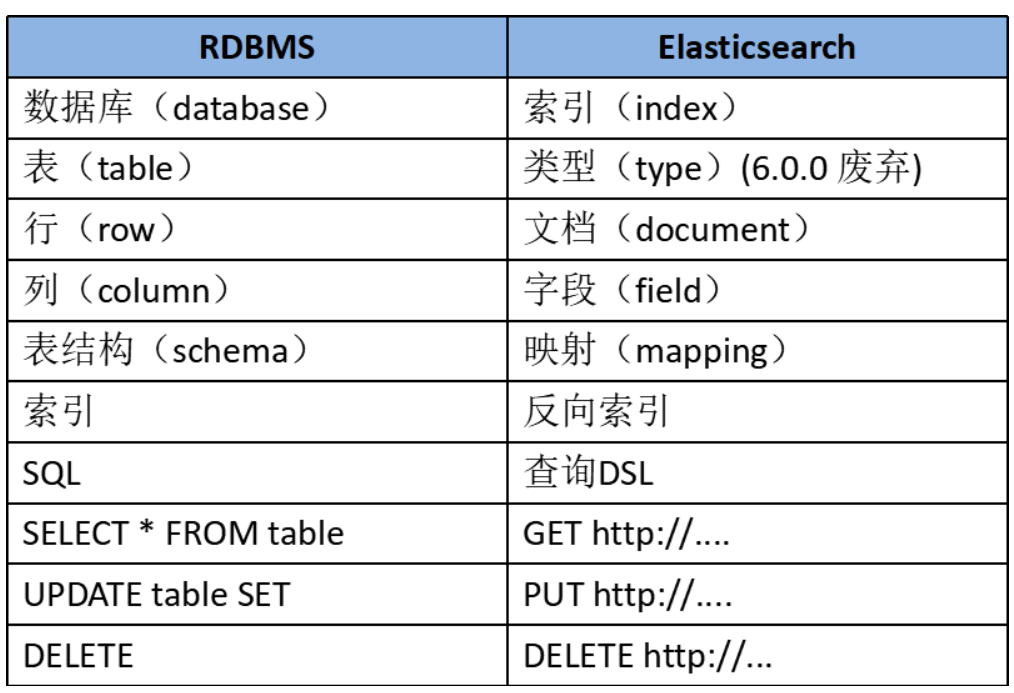 ES 里的 Index 可以看做一个库,而 Types 相当于表,Documents 则相当于表的行。这里 Types 的概念已经被逐渐弱化,Elasticsearch 6.X 中,一个 index 下已经只能包含一个 type,Elasticsearch 7.X 中,Type 的概念已经被删除了。
