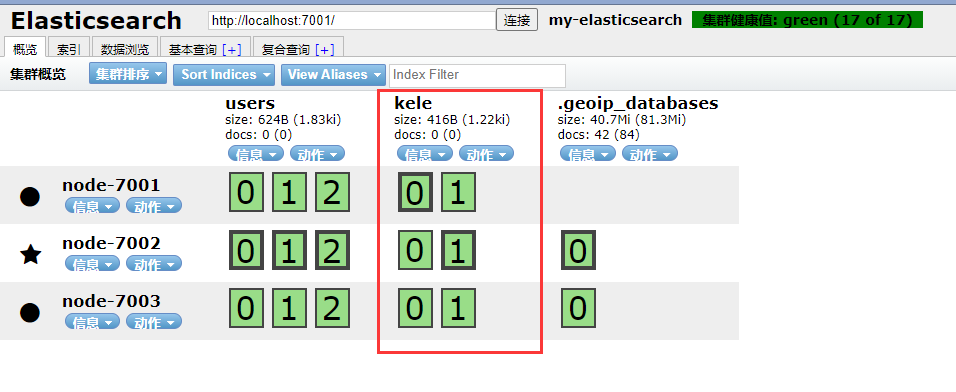 通过 elasticsearch-head 插件查看集群情况,所以我们的集群是一个有三个节点和一个索引的集群