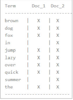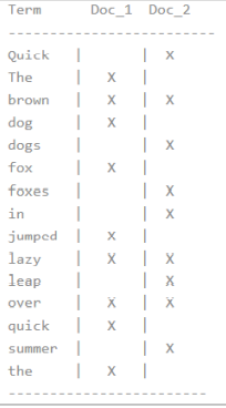 为了创建倒排索引,我们首先将每个文档的 content 域拆分成单独的词(我们称它为词条或 tokens ),创建一个包含所有不重复词条的排序列表,然后列出每个词条出现在哪个文档。结果如下所示:(X 代表存在)