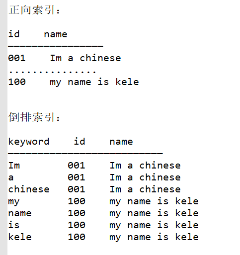 倒排索引流程:查询 kele,只需要遍历 keyword,通过 keyword 找到 id,就可以获取 name。