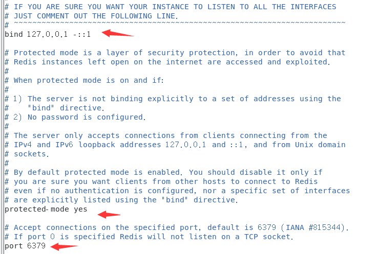 port 6379 # 默认端口默认情况 bind=127.0.0.1 只能接受本机的访问请求,如果注释掉或不写的情况下,无限制接受任何 ip 地址的访问。