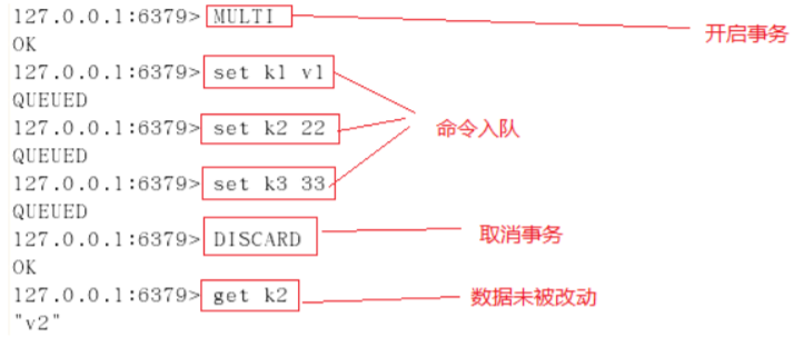 # 输出 v1使用了 discard,代表取消事务,则事务里的 set k1 v2 没有被执行,所以 k1 值依然是 1。