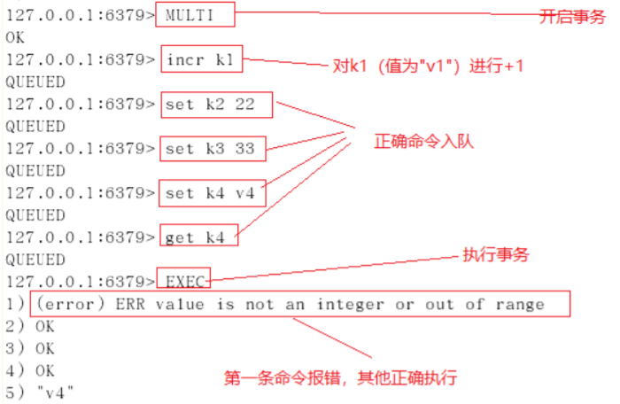 若在事务队列中存在语法性错误(类似于 Java 的 1/0 的运行时异常),则执行 EXEC 命令时,其他正确命令会被执行,错误命令抛出异常。