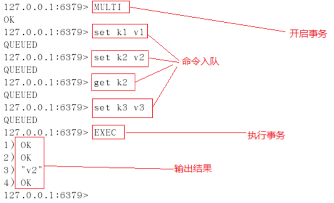 # 输出 v1、v2在没有 exec 之前,set 和 get 并没有立即执行,它们仅仅进入了命令队列,等待 exec 命令后再全部执行。