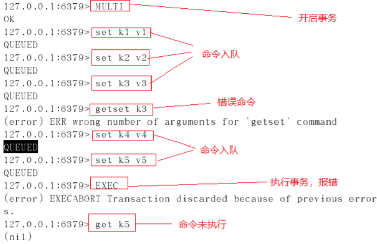 若在事务队列中存在命令性错误(类似于 Java 编译性错误),则执行 EXEC 命令时,所有命令都不会执行