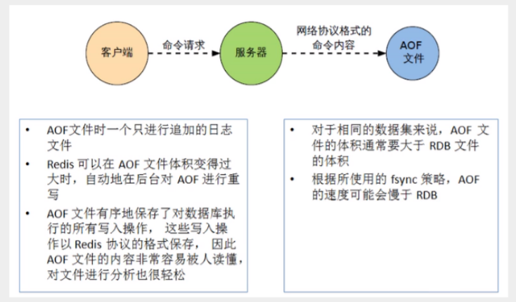 AOF 持久化方式记录每次对服务器写的操作,当服务器重启的时候会重新执行这些命令来恢复原始的数据,AOF 命令以 Redis 协议追加保存每次写的操作到文件末尾
