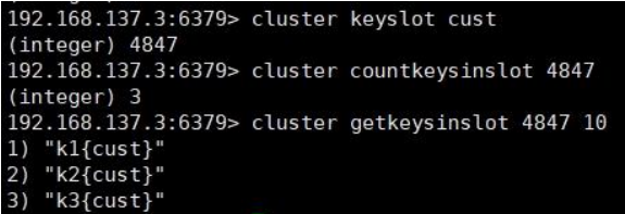 cluster getkeysinslot <slot> <count> # 返回 count 个 slot 槽中的键